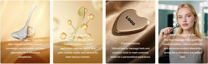 We specialize in the design, development, production, and sales of beauty and makeup tools. Our main products include beauty instruments, eye cream sticks, makeup spoons, face-slimming sticks, scraping tools, and other facial beauty accessories. With a complete supply chain system, we offer professional one-stop services and undertake OEM/ODM development.